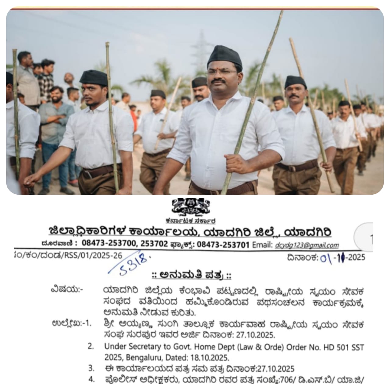 ಯಾದಗಿರಿ ಜಿಲ್ಲೆಯ ಕೆಂಭಾವಿ ಪಟ್ಟಣದಲ್ಲಿ RSS ಪಥಸಂಚಲಕ್ಕೆ ಒಪ್ಪಿಕೊಟ್ಟ DC ರಾಷ್ಟ್ರೀಯ ಸ್ವಯಂಸೇವಕ ಸಂಘ ಕೆಂಭಾವಿ